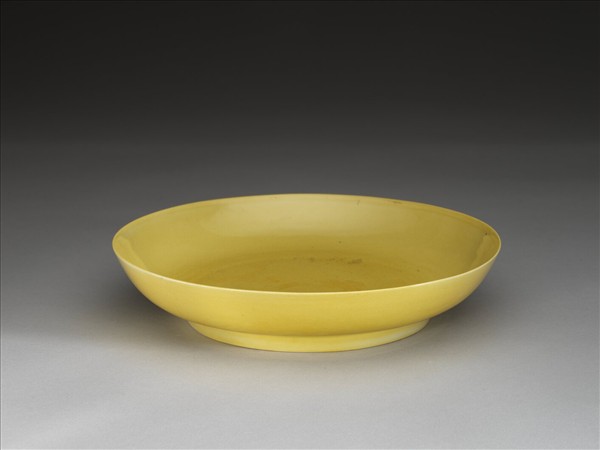 敞口、淺弧壁、帶圈足,足緣、口沿皆薄而細緻。器內外壁施黃釉、胎釉細膩,色澤勻淨明潔。器底白釉,書青花「大明弘治年製」雙行六字雙圈款。明代的黃釉,係在素胎上掛高溫透明釉後,再以澆釉的方法澆淋低溫黃釉,燒成後,色清亮無雜點,透明度高。宣德時己燒造此種釉色,終明之世,各朝均有造作。但釉汁的明淨嬌嫩,以弘治朝為最出色,有「嬌黃」之稱。是官家的色澤,明中葉曾禁止民間使用。