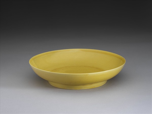 敞口、淺弧壁、帶圈足,足緣、口沿皆薄而細緻。器內外壁施黃釉、胎釉細膩,色澤勻淨明潔。器底白釉,書青花「大明弘治年製」雙行六字雙圈款。明代的黃釉,係在素胎上掛高溫透明釉後,再以澆釉的方法澆淋低溫黃釉,燒成後,色清亮無雜點,透明度高。宣德時己燒造此種釉色,終明之世,各朝均有造作。但釉汁的明淨嬌嫩,以弘治朝為最出色,有「嬌黃」之稱。是官家的色澤,明中葉曾禁止民間使用。