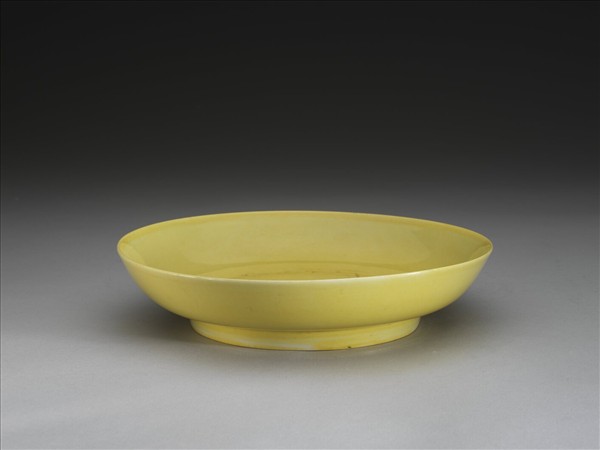 敞口、淺弧壁、帶圈足,足緣、口沿皆薄而細緻。器內外壁施黃釉、胎釉細膩,色澤勻淨明潔。器底白釉,書青花「大明弘治年製」雙行六字雙圈款。明代的黃釉,係在素胎上掛高溫透明釉後,再以澆釉的方法澆淋低溫黃釉,燒成後,色清亮無雜點,透明度高。宣德時己燒造此種釉色,終明之世,各朝均有造作。但釉汁的明淨嬌嫩,以弘治朝為最出色,有「嬌黃」之稱。是官家的色澤,明中葉曾禁止民間使用。