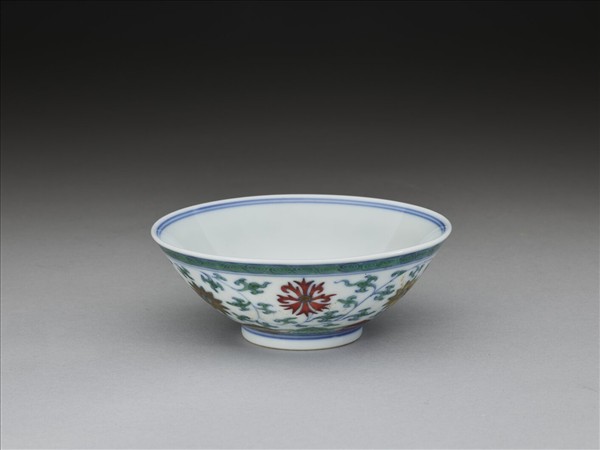 敞口,深壁,矮圈足。外壁以鬥彩畫纏枝花卉六朵,口沿畫螺旋紋一周,底邊畫如意雲紋一周,口足間加飾青線五道。碗內口沿畫雙線,底心畫折枝花一朵,邊加雙線。底有青花書「大清雍正年製」二行六字楷款,外加雙圈。