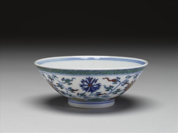 敞口,深壁,矮圈足。外壁以鬥彩畫纏枝花卉六朵,口沿畫螺旋紋一周,底邊畫如意雲紋一周,口足間加飾青線五道。碗內口沿畫雙線,底心畫折枝花一朵,邊加雙線。底有青花書「大清雍正年製」二行六字楷款,外加雙圈。
