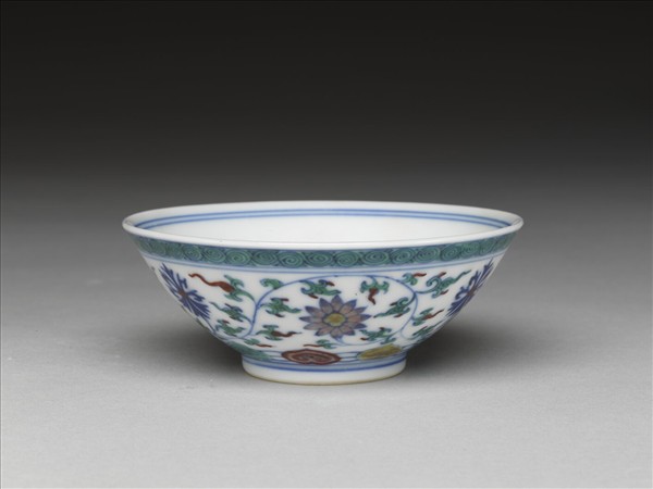 敞口,深壁,矮圈足。外壁以鬥彩畫纏枝花卉六朵,口沿畫螺旋紋一周,底邊畫如意雲紋一周,口足間加飾青線五道。碗內口沿畫雙線,底心畫折枝花一朵,邊加雙線。底有青花書「大清雍正年製」二行六字楷款,外加雙圈。