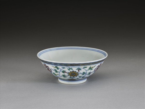 敞口,深壁,矮圈足。外壁以鬥彩畫纏枝花卉六朵,口沿畫螺旋紋一周,底邊畫如意雲紋一周,口足間加飾青線五道。碗內口沿畫雙線,底心畫折枝花一朵,邊加雙線。底有青花書「大清雍正年製」二行六字楷款,外加雙圈。