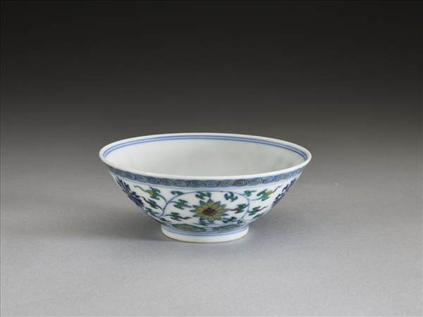 敞口,深壁,矮圈足。外壁以鬥彩畫纏枝花卉六朵,口沿畫螺旋紋一周,底邊畫如意雲紋一周,口足間加飾青線五道。碗內口沿畫雙線,底心畫折枝花一朵,邊加雙線。底有青花書「大清雍正年製」二行六字楷款,外加雙圈。