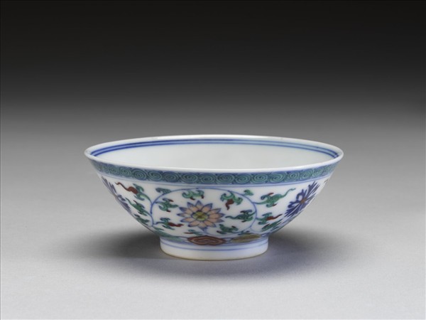 敞口,深壁,矮圈足。外壁以鬥彩畫纏枝花卉六朵,口沿畫螺旋紋一周,底邊畫如意雲紋一周,口足間加飾青線五道。碗內口沿畫雙線,底心畫折枝花一朵,邊加雙線。底有青花書「大清雍正年製」二行六字楷款,外加雙圈。