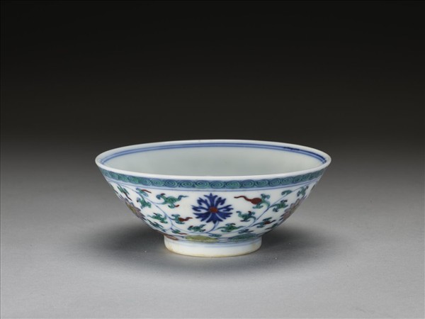 敞口,深壁,矮圈足。外壁以鬥彩畫纏枝花卉六朵,口沿畫螺旋紋一周,底邊畫如意雲紋一周,口足間加飾青線五道。碗內口沿畫雙線,底心畫折枝花一朵,邊加雙線。底有青花書「大清雍正年製」二行六字楷款,外加雙圈。