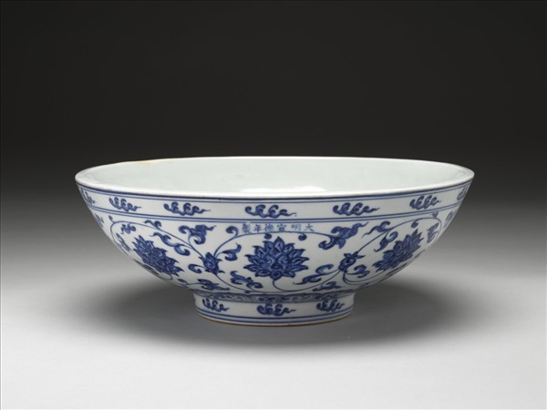 圓口微侈,淺壁,矮圈足。外壁畫纏枝番蓮花八朵,底邊畫變形蕉葉紋,口足各畫雲氣紋一周,加飾青線八道。內面純白釉,樸素無紋飾。口沿下有青花書「大明宣德年製」六楷字橫款。