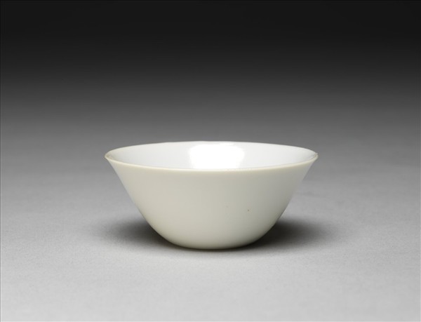 侈口,深壁、淺圈足。半脫胎,甜白釉,樸素無紋飾。底有青花書「大明宣德年製」六楷字款,外加單圈。