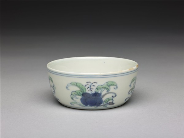 斂口,矮壁,淺圈足。底心青花書梵文九字,加飾十字杵形紋及蓮瓣邊,內壁純白無紋飾。外面彩畫花卉四折枝,上下加飾青線三道。底有青花書「大明成化年製」六楷字款,外加雙方圈。