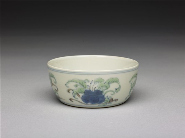 斂口,矮壁,淺圈足。底心青花書梵文九字,加飾十字杵形紋及蓮瓣邊,內壁純白無紋飾。外面彩畫花卉四折枝,上下加飾青線三道。底有青花書「大明成化年製」六楷字款,外加雙方圈。