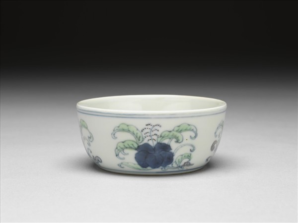 斂口,圓腹、淺弧形壁、平底、淺圈足。器內底心中央青花繪十字杵,周圍一圈蓮瓣紋,其內各填一梵字,共九字。器外口沿青線二道,腹壁以青花勾勒花卉四朵,花心加點紅彩蕊,花梗莖染以淡紫色,襯以綠葉。器底青線一道。器底青花書雙方框「大明成化年製」楷體六字款。