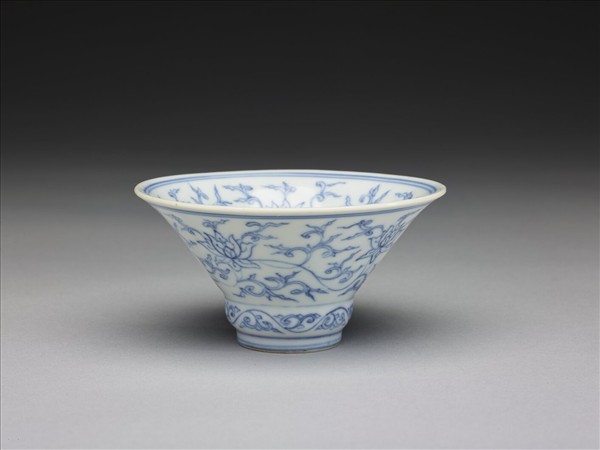 均侈口,深壁折腰,矮圈足。內外壁各畫纏枝番蓮四朵,底心一枝,外面底邊畫轉枝花葉一周,內外花紋間加飾青線十二道。底均有青花書「大明成化年製」六楷字款,外加雙方圈。