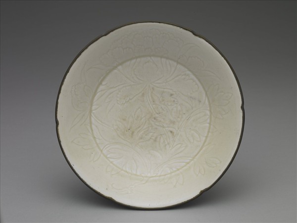 盤,六瓣葵花口,深壁,折底內收,矮圈足,帶銅釦。全器施牙白色釉,釉色勻潤。器內底及周內壁劃牡丹花紋,外壁滿劃轉枝牡丹四朵。定窯窯址位在河北省曲陽縣澗磁村、燕山村一帶,窯場廣佈,是宋金時期北方最著名盛燒的白瓷窯場。