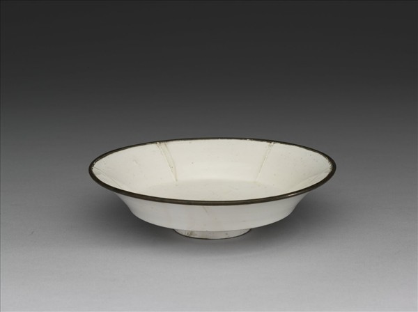 碗,侈口,淺周壁,內底心微凹,矮圈足,帶銅釦。全器施罩白釉,釉色潔白瑩潤,有若干縮釉小棕眼,外底足緣一周未上釉露胎,呈現有五處深褐色墊燒斑痕。胎骨較薄,器內壁劃分為六格,樸素無紋,內底心有支釘痕五枚。定窯窯址位在河北省曲陽縣澗磁村、燕山村一帶,窯場廣佈,是宋元時期北方最著名盛燒的白瓷窯場。
