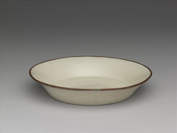 碟,侈口,淺周壁,平底無足,帶金屬釦。器內底心劃蓮花一枝,器內外周壁樸素無紋飾。厚胎,施罩白釉,釉色微帶黃,器表釉面有黃褐色開片紋及縮釉棕眼痕跡。定窯窯址位在河北省曲陽縣澗磁村、燕山村一帶,窯場廣佈,是金代北方最著名盛燒的白瓷窯場。