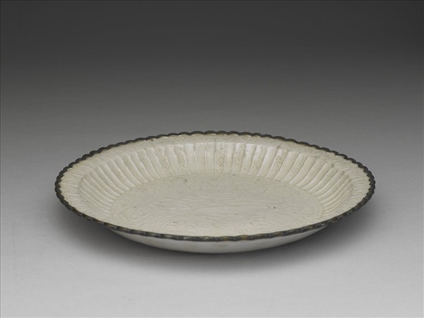 盤,多瓣菊花形,侈口折沿,淺周壁,平底,鑲銅釦。模製印花成形,器內口唇折沿上印菊瓣紋一周,周內壁有勾雲紋,內底心印四季花卉,中飾臥鹿一隻。全器施罩牙白色釉,釉色微微帶黃。定窯窯址位在河北省曲陽縣澗磁村、燕山村一帶,窯場廣佈,是宋元時期北方最著名盛燒的白瓷窯場。