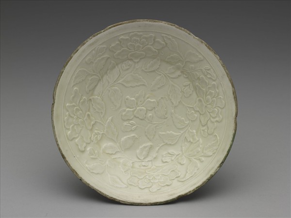 洗,六瓣葵花口,深周壁,折腹內收,平底,矮圈足。器內口沿邊印弦紋一道,周內壁印轉枝牡丹紋五朵。薄胎骨,施罩牙白色釉,釉色微帶黃,器外壁可見有燒造時積釉流淌的「淚痕」,口沿露胎一周未上釉。