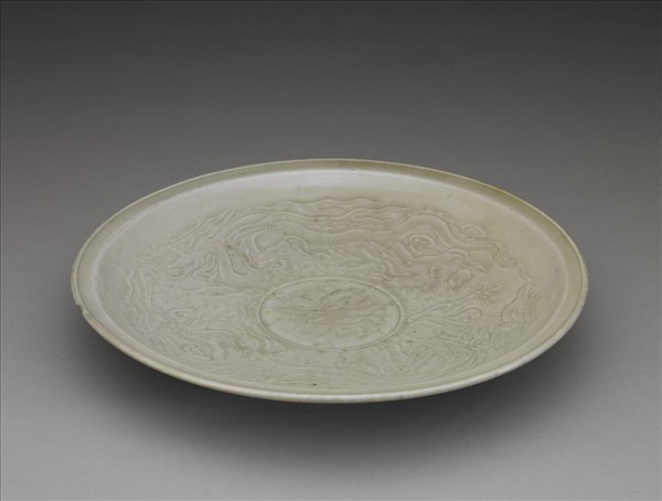 盤,折口出唇,淺周壁,內底微凹,矮圈足。盤內周壁模印二尾龍紋,首尾相連,清晰可辨,內底心印勾雲紋。全器施罩影青釉,外底足內壁及足緣一周未上釉,口緣外有一處舊傷缺。