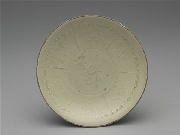 盤,六瓣葵花口,侈口,淺弧形壁,平底,矮圈足。器內口沿下印回紋一道,周內壁勒印區分六格,分別印飾葡萄、石榴等花果紋,內底勒印一圈,中心印有一株柿果紋。胎骨較薄,施牙白色釉,釉色微微帶灰,口沿一周露胎未上釉。定窯主要窯址位在河北省曲陽縣澗磁村、燕山村一帶,窯場廣佈,是宋金時期北方最著名盛燒的白瓷窯場。