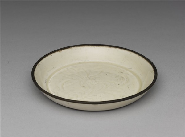 碟,侈圓口,淺周壁,平底無足,帶銅釦。器內底心劃蓮花一枝,器內外周壁樸素無紋。器胎骨較厚,施罩牙白色釉,釉色微黃,器表釉面有若干縮釉棕眼痕跡。定窯主要窯址位在河北省曲陽縣澗磁村、燕山村一帶,窯場廣佈,是宋元時期北方最著名盛燒的白瓷窯場。