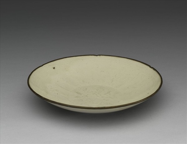 盤,六瓣葵花口,深周壁,平底,矮圈足,帶銅釦。器內口沿下印雲紋一道,器內壁勒印區分六格,每格分印牡丹、蓮花各一枝,內底心印菊花二枝,外壁樸素無紋。全器施牙白色釉,胎骨稍厚,釉色略帶灰,器表釉面有縮釉棕眼痕。定窯主要窯址位在河北省曲陽縣澗磁村、燕山村一帶,窯場廣佈,是宋元時期北方最著名盛燒的白瓷窯場。