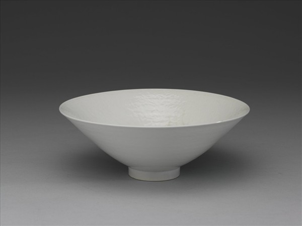 碗,敞口,深斜壁,平底,矮圈足。全器施白釉,器壁滿布開片紋。器內壁劃花為飾,口沿兩道弦紋,壁淺劃纏枝花卉,底心兩道弦紋內劃雙魚紋。