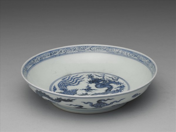 盤,侈口,淺弧壁,矮圈足。青花釉彩,釉色濃艷,多處帶褐綠疵斑。口沿內畫卷草紋一周,盤心及外壁各畫龍鳳紋一對,穿行於十字雲紋之中。口沿內外、盤底心和足外加飾弦紋八道。