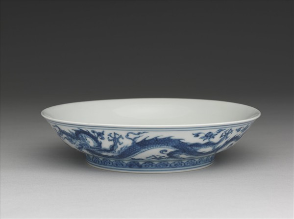盤,侈口,淺弧壁,矮圈足。青花釉彩,外壁口沿下飾弦紋兩道,外壁畫青龍二條,加飾纏枝番蓮花。圈足外畫如意雲頭紋一周,上下共飾弦紋四道。內面純白,樸素無紋飾。器外底無款。