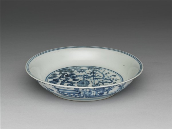 盤,侈口微撇,弧壁,矮圈足。青花釉彩,口沿內外飾弦紋兩道。盤內底心雙圈內畫松、竹、梅三友,加飾湖石、靈芝。外壁畫庭園景色,一仕女坐於欄杆前,另三仕女,一燒香,一撲螢,一捧物自室內走出,室內畫屏中置。腹底兩道弦紋。圈足外各飾弦紋兩道。