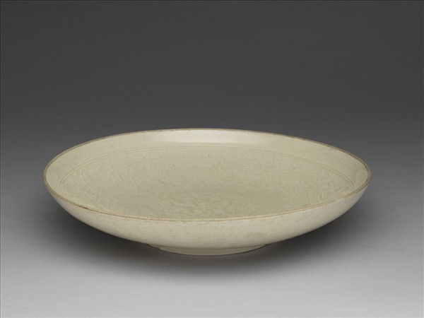 大盤,敞口,淺弧壁,平底,矮圈足。全器施白釉,釉色泛黃。器內印花為飾。口沿下兩道弦紋,內壁印牡丹孔雀紋飾。器內底心印一圈回紋,中心印蓮塘鴛鴦。