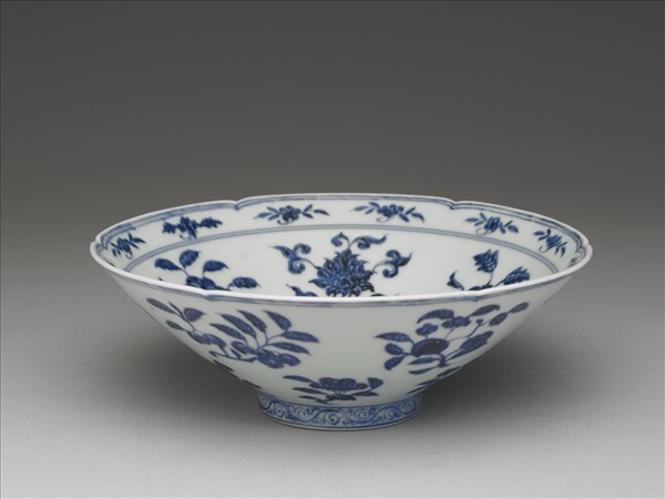 碗,六瓣葵花形口,深壁,矮圈足。碗內口沿下兩道弦紋間畫各種花卉十二朵,內壁畫四季花卉六枝,底心三圈弦紋內畫桃實一枝。外壁口沿下弦紋兩道,器身畫折枝花、果分上下二層各六枝。足壁上下圈畫弦紋兩道,內飾勾雲紋一周。器外底青花雙圈書「大明宣德年製」兩行楷款。