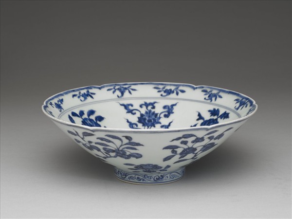 碗,六瓣葵花形口,深壁,矮圈足。碗內口沿下兩道弦紋間畫各種花卉十二朵,內壁畫四季花卉六枝,底心三圈弦紋內畫桃實一枝。外壁口沿下弦紋兩道,器身畫折枝花、果分上下二層各六枝。足壁上下圈畫弦紋兩道,內飾勾雲紋一周。器外底青花雙圈書「大明宣德年製」兩行楷款。