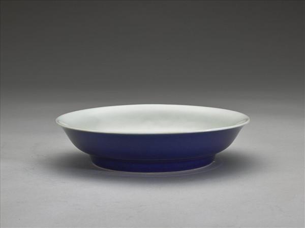 侈口窄唇,淺壁,矮圈足。內壁錐拱雙龍紋,模糊不清。胎質較厚,外面霽青釉,盤裡及底均純白。底有青花書「大明宣德年製」六楷字款,外加雙圈。
