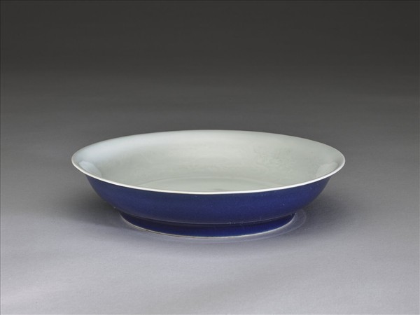 侈口窄唇,淺壁,矮圈足。內壁錐拱雙龍紋,模糊不清。胎質較厚,外面霽青釉,盤裡及底均純白。底有青花書「大明宣德年製」六楷字款,外加雙圈。