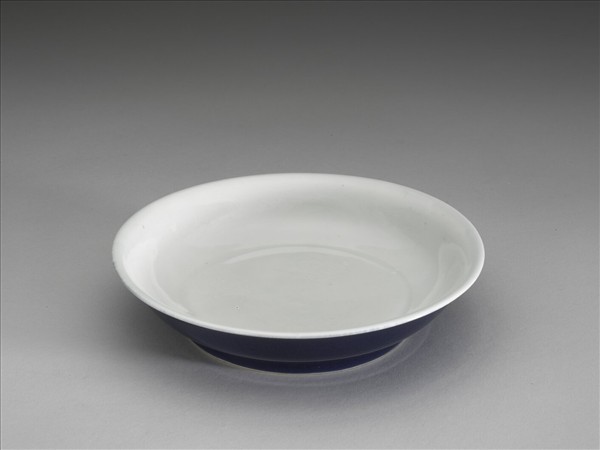 侈口窄唇,淺壁,矮圈足。內壁錐拱雙龍紋,模糊不清。胎質較厚,外面霽青釉,盤裡及底均純白。底有青花書「大明宣德年製」六楷字款,外加雙圈。