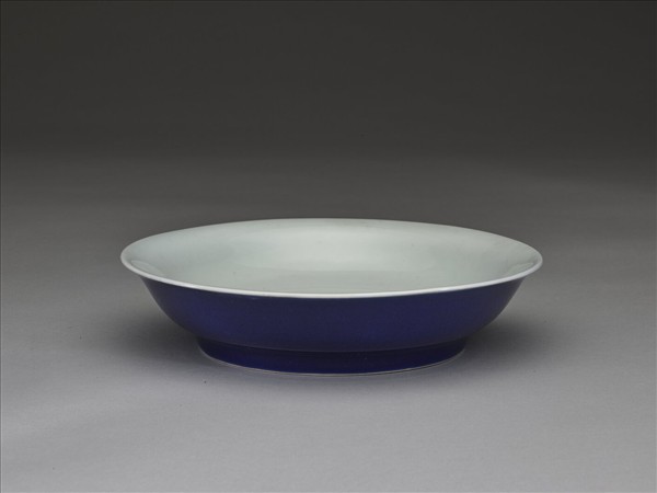 侈口窄唇,淺壁,矮圈足。內壁錐拱雙龍紋,模糊不清。胎質較厚,外面霽青釉,盤裡及底均純白。底有青花書「大明宣德年製」六楷字款,外加雙圈。