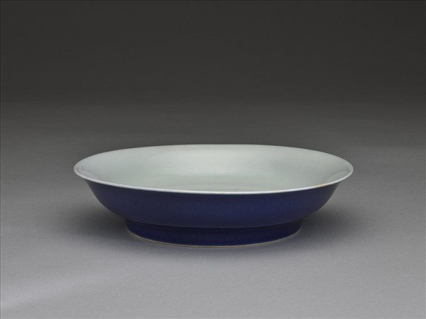 侈口窄唇,淺壁,矮圈足。內壁錐拱雙龍紋,模糊不清。胎質較厚,外面霽青釉,盤裡及底均純白。底有青花書「大明宣德年製」六楷字款,外加雙圈。