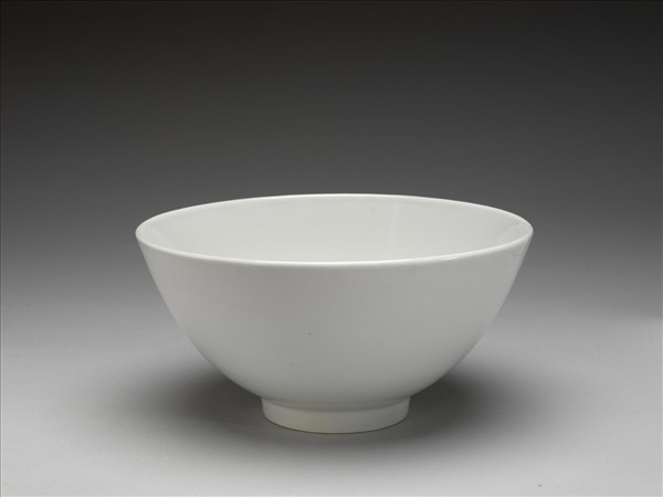 斂口,深壁,尖底,矮圈足,通稱蓮子碗。胎質較薄,通體甜白釉,樸素無紋飾。底有青花書「大明宣德年製」六楷字款,外加雙圈。