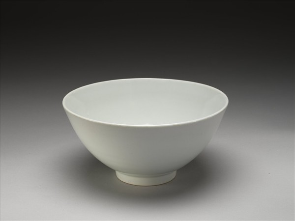 斂口,深壁,尖底,矮圈足,通稱蓮子碗。胎質較薄,通體甜白釉,樸素無紋飾。底有青花書「大明宣德年製」六楷字款,外加雙圈。