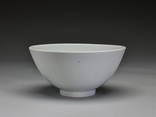 圓直口,深弧壁,小圈足,碗心內凹呈尖底狀,底微凸,俗稱雞心碗,一般因其碗形頗似蓮房,俗又稱「蓮子碗」。碗外壁刻劃雙層蓮瓣紋,口沿波濤紋一圈。內口沿淺劃回紋一圈,碗心為折枝石榴花果,外加雙圈。內壁無紋,各區紋飾間均劃淺線二道。釉色甜白腴厚,胎骨稍厚,圈足露胎處,潔白細膩。底青花書「大明宣德年製」二行六字楷款,外加雙青圈。