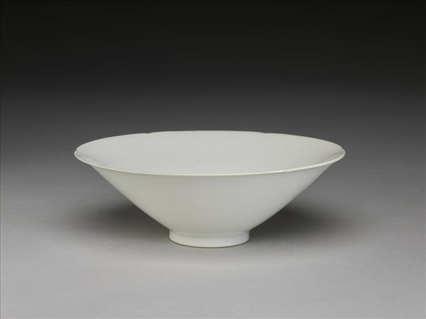 侈口,六瓣葵花形,深壁上豐下削,平底,矮圈足。內壁錐拱團龍六條,碗心錐拱勾雲紋一周。半脫胎,甜白釉,龍紋外面可見。碗心錐拱「永樂年製」四篆字暗款,外加單圈。