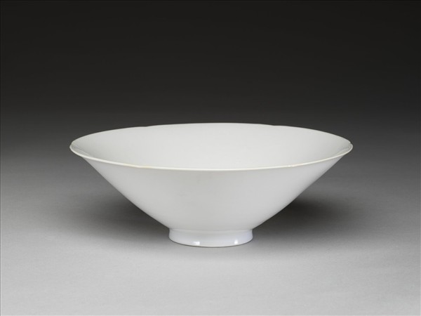 侈口,六瓣葵花形,深壁上豐下削,平底,矮圈足。內壁錐拱團龍六條,碗心錐拱勾雲紋一周。半脫胎,甜白釉,龍紋外面可見。碗心錐拱「永樂年製」四篆字暗款,外加單圈。