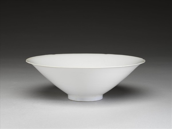 侈口,六瓣葵花形,深壁上豐下削,平底,矮圈足。內壁錐拱團龍六條,碗心錐拱勾雲紋一周。半脫胎,甜白釉,龍紋外面可見。碗心錐拱「永樂年製」四篆字暗款,外加單圈。