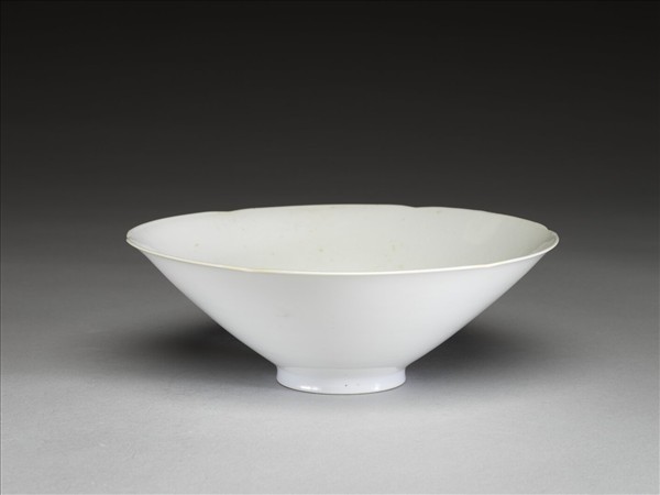 侈口,六瓣葵花形,深壁上豐下削,平底,矮圈足。內壁錐拱團龍六條,碗心錐拱勾雲紋一周。半脫胎,甜白釉,龍紋外面可見。碗心錐拱「永樂年製」四篆字暗款,外加單圈。