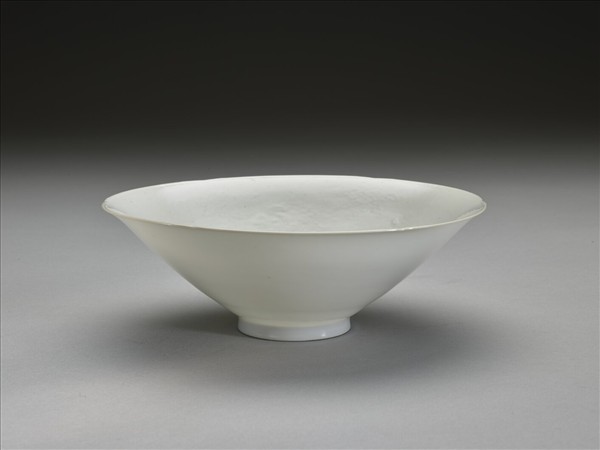 侈口,六瓣葵花形,深壁上豐下削,平底,矮圈足。內壁錐拱團龍六條,碗心錐拱勾雲紋一周。半脫胎,甜白釉,龍紋外面可見。碗心錐拱「永樂年製」四篆字暗款,外加單圈。
