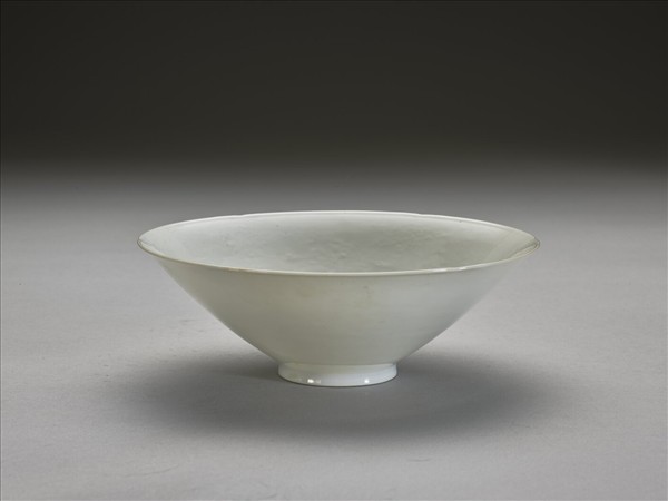 侈口,六瓣葵花形,深壁上豐下削,平底,矮圈足。內壁錐拱團龍六條,碗心錐拱勾雲紋一周。半脫胎,甜白釉,龍紋外面可見。碗心錐拱「永樂年製」四篆字暗款,外加單圈。