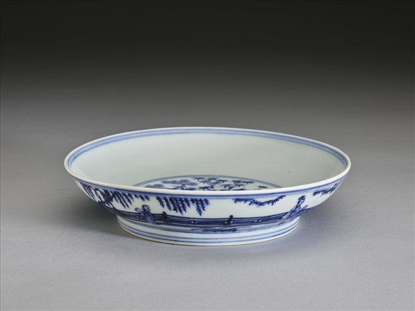 侈口,圓弧淺壁,平底,底略呈內凹外凸,矮圈足。盤心畫松、竹、梅三友,加飾靈芝、湖石、草紋,及青線二道。外壁紋飾為庭園景物,仕女秉燭夜遊其間,足圈飾卷草紋一周,口足間加飾青線六道。胎骨勻薄,盤底內凹外凸,青花艷麗,圈足露胎處,質堅細膩。底青花書「大明宣德年製」二行六字楷款,外加雙圈。