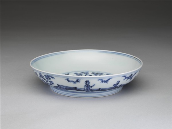 侈圓口,淺弧壁,矮圈足,盤心紋飾,為松、竹、梅歲寒三友紋。外壁紋飾描繪園林湖石,一仕女拈花遊憩其間,另有四侍女隨侍。侍女或作揖、或捧琴、或捧物。口足間加飾青線八道。青花釉色青豔明麗,濃淡不一,帶褐綠色斑及鐵褐疵斑。釉面細小氣泡疏朗明亮。胎骨微厚略重,盤心內凹,底微凸,圈足露胎,質堅細膩,略帶鐵質斑點,胎釉一線呈淺橘色。盤底青花書「大明宣德年製」二行六字楷款,外加雙圈。此類園林仕女圖,為宣德青花器所喜用紋飾,本院另藏有侈口碗亦為同類紋飾。