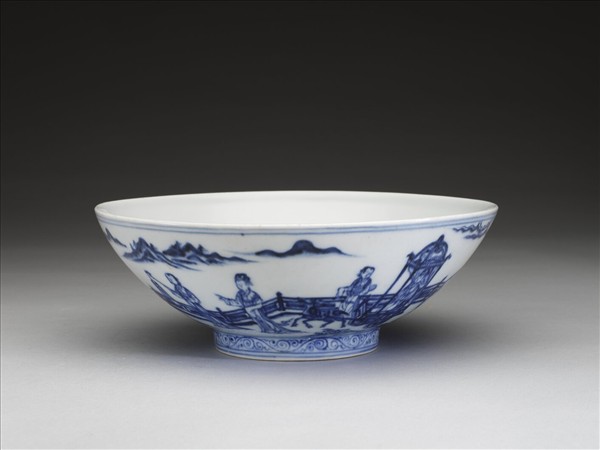 青花山水仕女圖碗