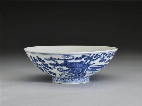 侈口,弧壁,矮圈足,底微凸。外壁畫山水樓閣,一仙女駕鶴自雲端朝向樓閣而來,樓閣建築描繪細膩,前後松樹四棵,山林樹石點景其間,捲邊雲紋高低起伏,圈足卷草紋一周,口足間加飾青線六道。內壁白釉無紋泛青,積釉處尤甚,青花濃豔泛紫,濃處偶帶鐵褐色疵斑,釉面氣泡疏朗清澈。胎骨勻稱,外底微凸,圈足足底無釉,修削平整,露胎處略帶細小鐵質斑點。底書「大明宣德年製」二行六字楷款,外加雙圈。院藏宣德青花仙女圖碗,有雙姝駕鳳、吹蕭引鳳、仙女乘鶴等等,此圖樹石聳立,樓閣欄檻鉤窗,簾垂飄帶,氣勢宏偉,景緻特別,與界畫樓閣相似,為明代建築的寫實描畫。